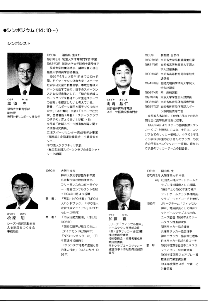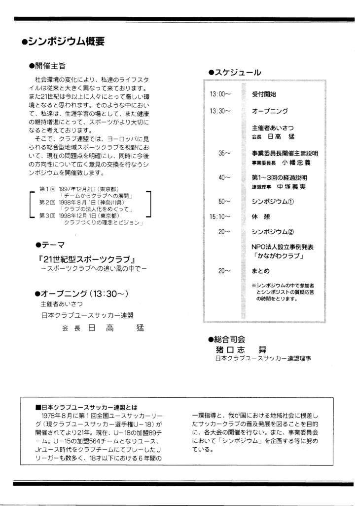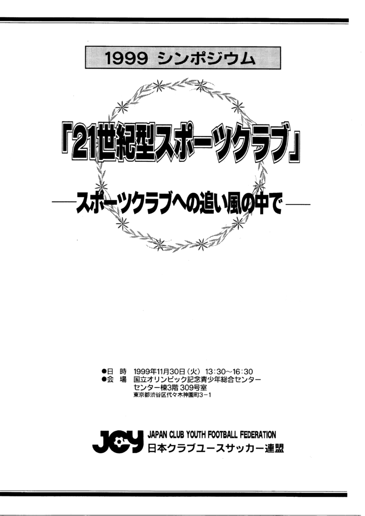 「クラブ連盟では、ヨーロッパに見られる総合型地域スポーツクラブを視野において、現在の問題点を明確にし、同時に今後の方向性について広く意見の交換を行うシンポジウムを開催いたします。」